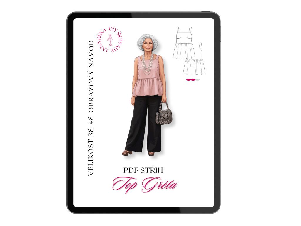 Střih topu Gréta představuje letní kousek, který respektuje ženské křivky a dává volnost. Působí jednoduše a přitom elegantně. Má dvě varianty ramínek.