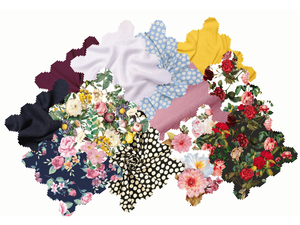 Souprava obsahuje vzorky látek, které jsou vhodné na ušití kalhot Nina. Jejich výběr a množství se řídí skladovými zásobami.